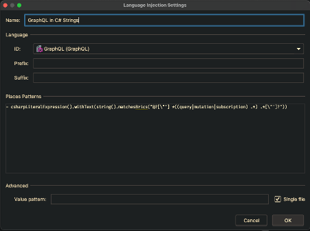 Now every string in C# that starts with either query, mutation, or subscription will be interpreted by Rider as a GraphQL Query.