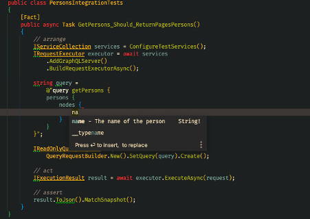 public class PersonsIntegrationTests{ [Fact] public async Task GetPersons_Should_ReturnPagesPersons() { // arrange IServiceCollection services = ConfigureTestServices(); IRequestExecutor executor = await services .AddGraphQLServer() .BuildRequestExecutorAsync();