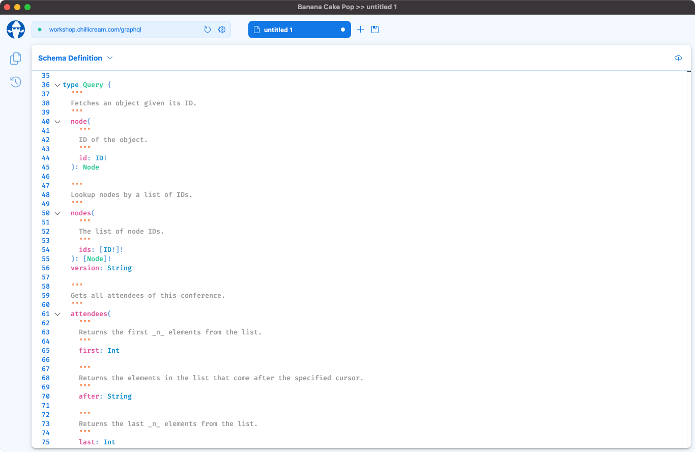 The "Schema Definition" part of Banana Cake Pop allows you to see the raw Schema Definition Language (SDL) of your GraphQL server.